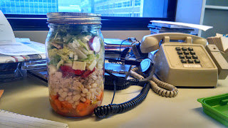 After that you may add rice or beans and chickpeas. And after that, chicken or tuna or tofu. And after that you pack in all this lettuce and then maybe one other thing on top of that -- toasted walnuts mayhap -- and then you screw on that lid after packing in as much lettuce as you can.